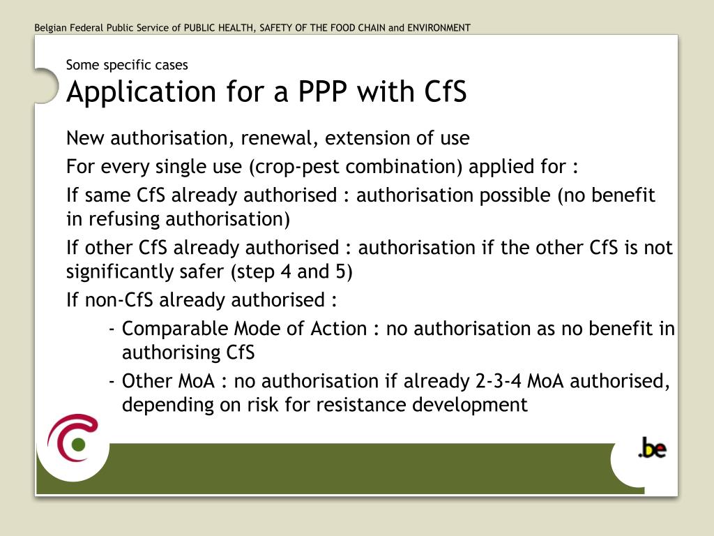 Somespecific cases Application for a PPP withCfS • New authorisation, renewal, extension of use • For every single use (crop-pest combination) appliedfor : • IfsameCfSalreadyauthorised : authorisationpossible (no benefit in refusingauthorisation) • IfotherCfSalreadyauthorised : authorisationif the otherCfS is notsignificantly safer (step 4 and 5) • If non-CfSalreadyauthorised : • Comparable Mode of Action : no authorisation as no benefit in authorisingCfS • OtherMoA : no authorisationifalready 2-3-4 MoAauthorised, depending on risk forresistancedevelopment