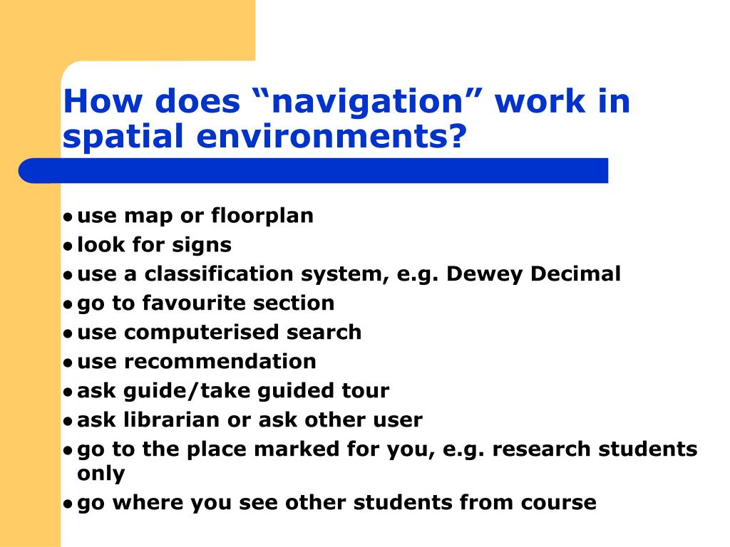 How does “navigation” work in spatial environments? • use map or floorplan • look for signs • use a classification system, e.g. Dewey Decimal • go to favourite section • use computerised search • use recommendation • ask guide/take guided tour • ask librarian or ask other user • go to the place marked for you, e.g. research students only • go where you see other students from course