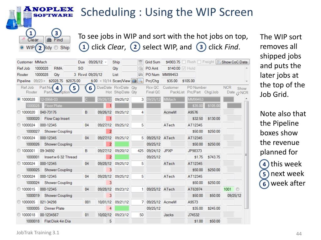 Scheduling : Using the WIP Screen To see jobs in WIP and sort with the hot jobs on top, The WIP sort removes all shipped jobs and puts the later jobs at the top of the Job Grid. Note also that the Pipeline boxes show the revenue planned for click Clear, select WIP, and click Find. 1 3 2 3 1 6 5 5 6 4 2 4 this week next week week after