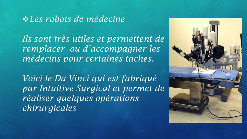 Les robots de médecine • Ils sont très utiles et permettent de remplacer ou d’accompagner les médecins pour certaines taches. • Voici le Da Vinci qui est fabriqué par Intuitive Surgical et permet de réaliser quelques opérations chirurgicales