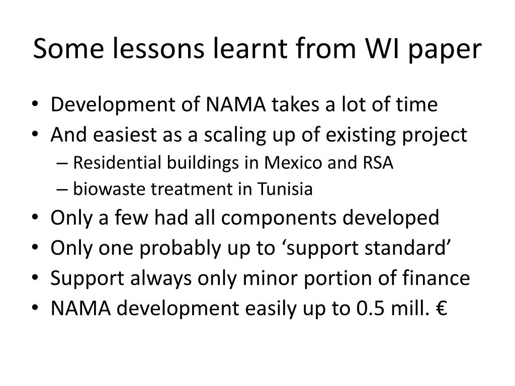Some lessons learnt from WI paper • Development of NAMA takes a lot of time • And easiest as a scaling up of existing project • Residential buildings in Mexico and RSA • biowaste treatment in Tunisia • Only a few had all components developed • Only one probably up to ‘support standard’ • Support always only minor portion of finance • NAMA development easily up to 0.5 mill. €