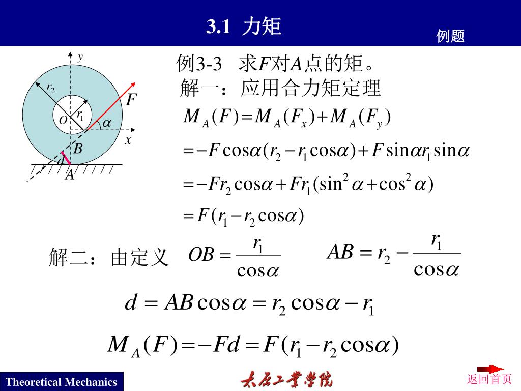 3.1 力矩 例题 例3-3 求F对A点的矩。 解一:应用合力矩定理 解二:由定义