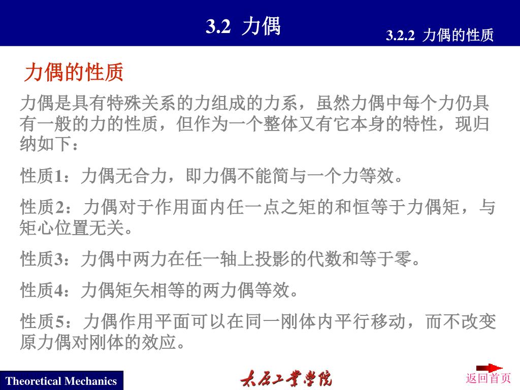 3.2 力偶 3.2.1 力偶的概念 力偶对刚体的作用完全决定于力偶矩矢。 (1)力偶矩矢量M与矩心的选择无关,因而是一个自由矢量; (2)决定力偶矩矢的三要素为:力偶矩的大小、力偶作用面的方位及力偶的转向; (3)因为力偶矩矢是自由矢量,在保持这一矢量的大小和方向不变的条件下,可以在空间任意移动力偶矩矢量而不改变力偶对刚体的作用效果,称为力偶的等效性。 Theoretical Mechanics