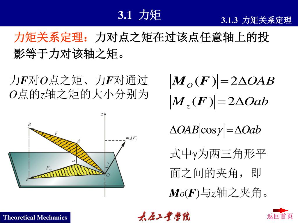 3.1 力矩 3.1.3 力矩关系定理 力矩关系定理:力对点之矩在过该点任意轴上的投影等于力对该轴之矩。 力F对O点之矩、力F对通过 O点的z轴之矩的大小分别为 式中为两三角形平面之间的夹角,即MO(F)与z轴之夹角。 Theoretical Mechanics