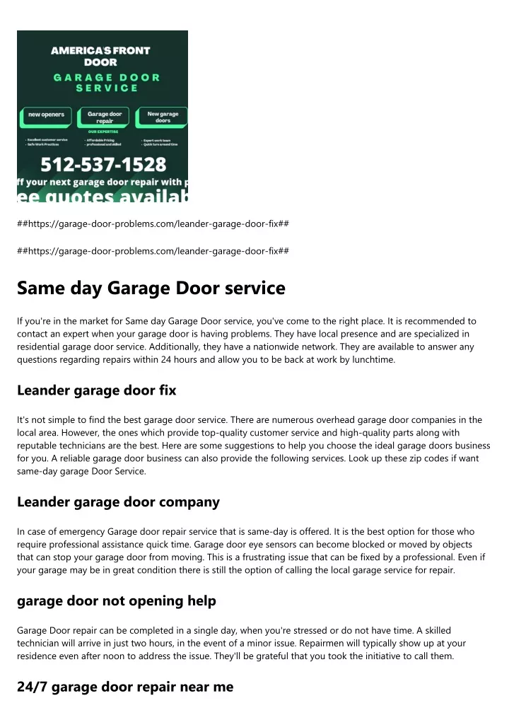 ##https://garage-door-problems.com/leander-garage-door-fix## ##https://garage-door-problems.com/leander-garage-door-fix## Same day Garage Door service If you're in the market for Same day Garage Door service, you've come to the right place. It is recommended to contact an expert when your garage door is having problems. They have local presence and are specialized in residential garage door service. Additionally, they have a nationwide network. They are available to answer any questions regarding repairs within 24 hours and allow you to be back at work by lunchtime. Leander garage door fix It's not simple to find the best garage door service. There are numerous overhead garage door companies in the local area. However, the ones which provide top-quality customer service and high-quality parts along with reputable technicians are the best. Here are some suggestions to help you choose the ideal garage doors business for you. A reliable garage door business can also provide the following services. Look up these zip codes if want same-day garage Door Service. Leander garage door company In case of emergency Garage door repair service that is same-day is offered. It is the best option for those who require professional assistance quick time. Garage door eye sensors can become blocked or moved by objects that can stop your garage door from moving. This is a frustrating issue that can be fixed by a professional. Even if your garage may be in great condition there is still the option of calling the local garage service for repair. garage door not opening help Garage Door repair can be completed in a single day, when you're stressed or do not have time. A skilled technician will arrive in just two hours, in the event of a minor issue. Repairmen will typically show up at your residence even after noon to address the issue. They'll be grateful that you took the initiative to call them. 24/7 garage door repair near me