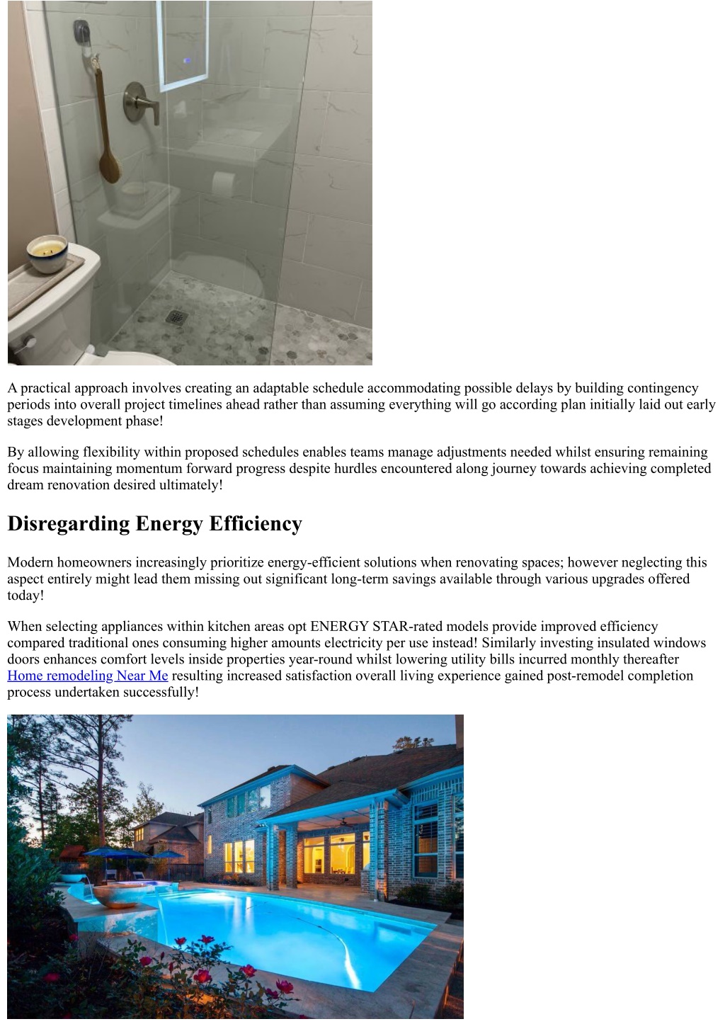 A practical approach involves creating an adaptable schedule accommodating possible delays by building contingency periods into overall project timelines ahead rather than assuming everything will go according plan initially laid out early stages development phase! By allowing flexibility within proposed schedules enables teams manage adjustments needed whilst ensuring remaining focus maintaining momentum forward progress despite hurdles encountered along journey towards achieving completed dream renovation desired ultimately! Disregarding Energy Efficiency Modern homeowners increasingly prioritize energy-efficient solutions when renovating spaces; however neglecting this aspect entirely might lead them missing out significant long-term savings available through various upgrades offered today! When selecting appliances within kitchen areas opt ENERGY STAR-rated models provide improved efficiency compared traditional ones consuming higher amounts electricity per use instead! Similarly investing insulated windows doors enhances comfort levels inside properties year-round whilst lowering utility bills incurred monthly thereafter Home remodeling Near Me resulting increased satisfaction overall living experience gained post-remodel completion process undertaken successfully!