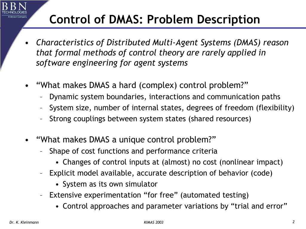 An Infrastructure for Adaptive Control of Multi-Agent Systems Dr. Karl Kleinmann, Richard Lazarus, Ray Tomlinson KIMAS, October 1, 2003 karl.kleinmann@bbn.com. Control of DMAS: Problem Description.