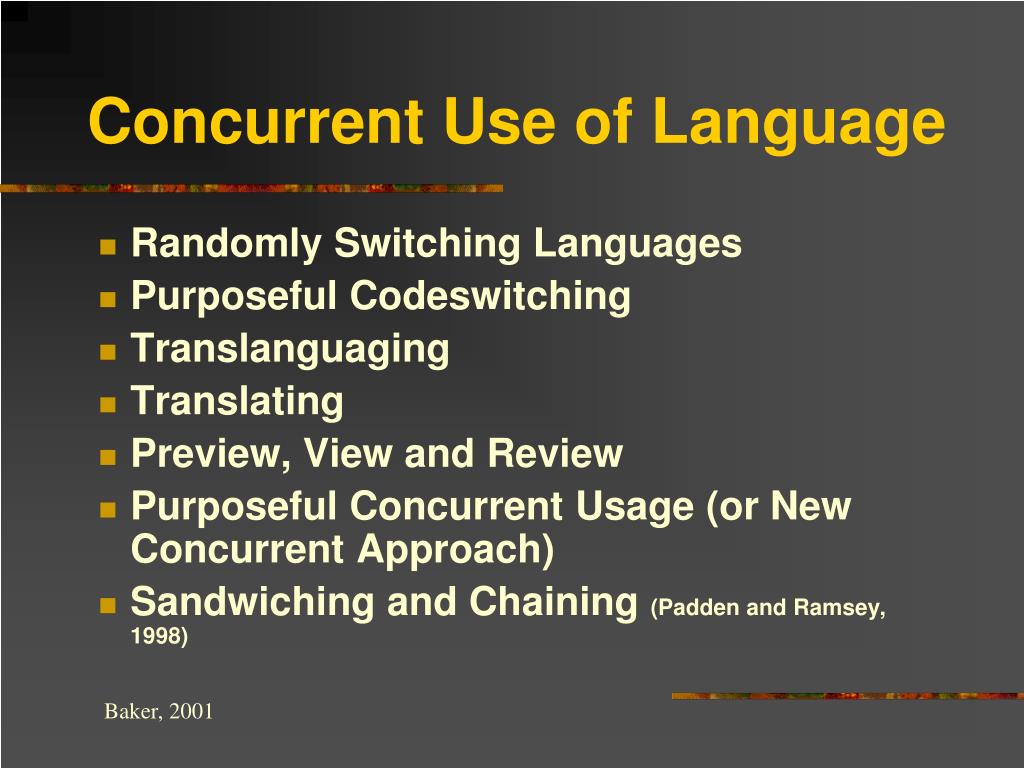 Concurrent Use of Language • Randomly Switching Languages • Purposeful Codeswitching • Translanguaging • Translating • Preview, View and Review • Purposeful Concurrent Usage (or New Concurrent Approach) • Sandwiching and Chaining (Padden and Ramsey, 1998) Baker, 2001
