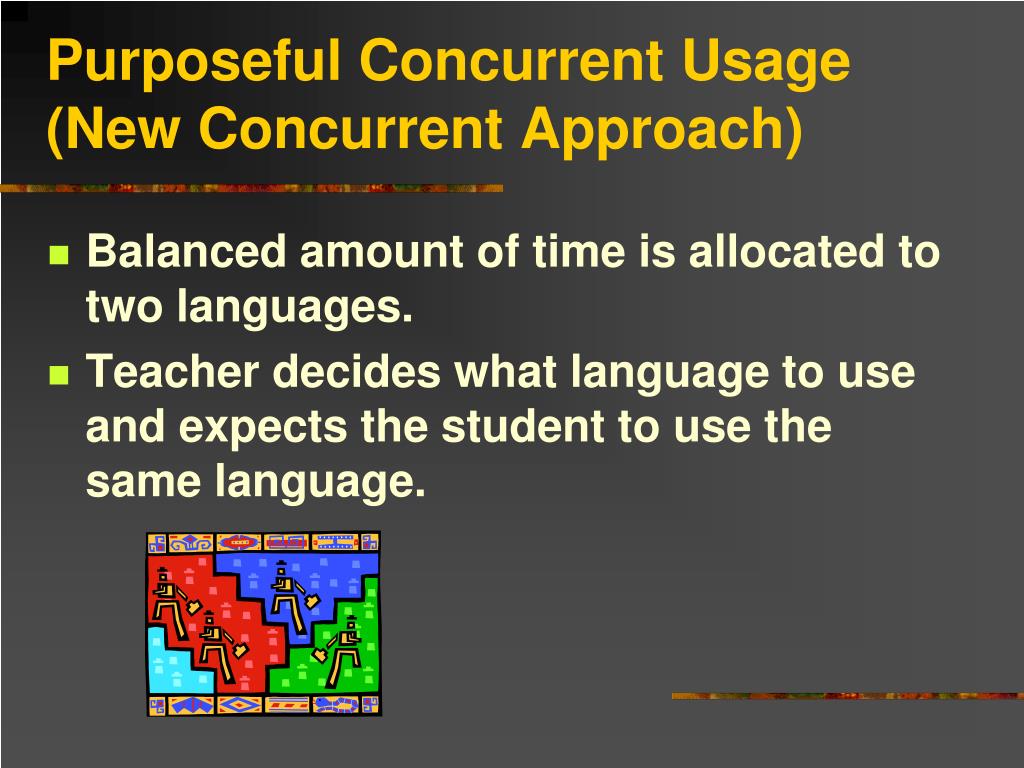 Purposeful Concurrent Usage(New Concurrent Approach) • Balanced amount of time is allocated to two languages. • Teacher decides what language to use and expects the student to use the same language.