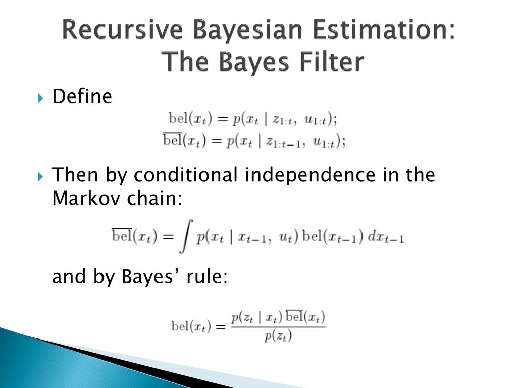 Recursive Bayesian Estimation: The Bayes Filter This shows how to compute given only and the control input . Recursive filter!