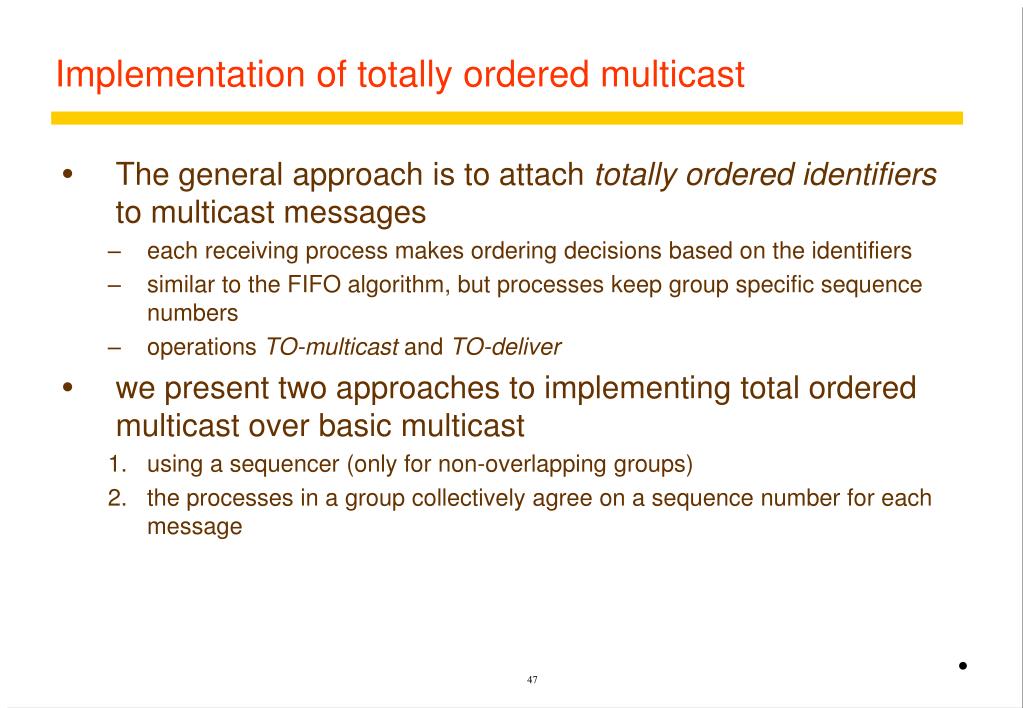 Implementation of totally ordered multicast • The general approach is to attach totally ordered identifiers to multicast messages • each receiving process makes ordering decisions based on the identifiers • similar to the FIFO algorithm, but processes keep group specific sequence numbers • operations TO-multicast and TO-deliver • we present two approaches to implementing total ordered multicast over basic multicast • using a sequencer (only for non-overlapping groups) • the processes in a group collectively agree on a sequence number for each message • 47