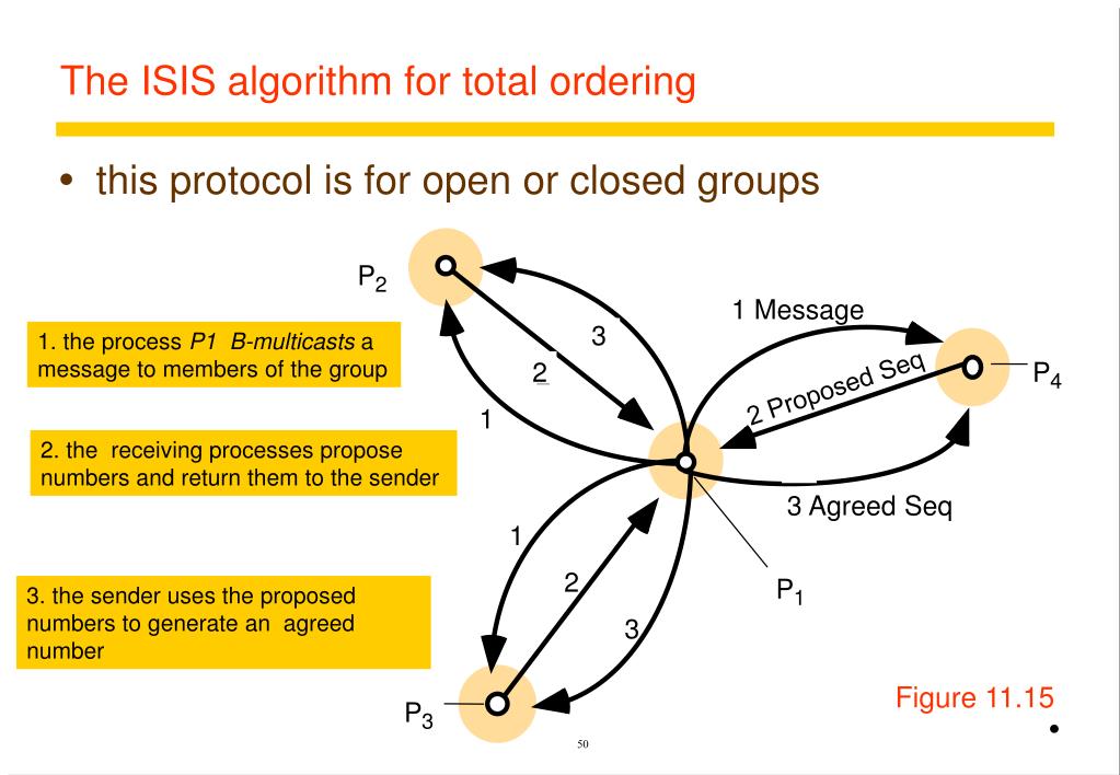 P 2 1 Message 3 2 P 2 4 2 Proposed Seq 1 3 Agreed Seq 1 2 P 1 3 Figure 11.15 P 3 The ISIS algorithm for total ordering • this protocol is for open or closed groups 1. the process P1 B-multicasts a message to members of the group 2. the receiving processes propose numbers and return them to the sender 3. the sender uses the proposed numbers to generate an agreed number • 50