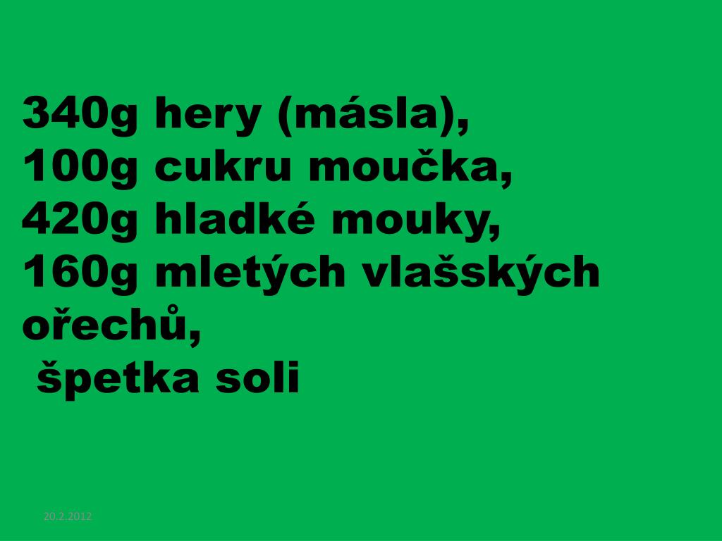 340g hery (másla), 100g cukru moučka, 420g hladké mouky, 160g mletých vlašských ořechů, špetka soli