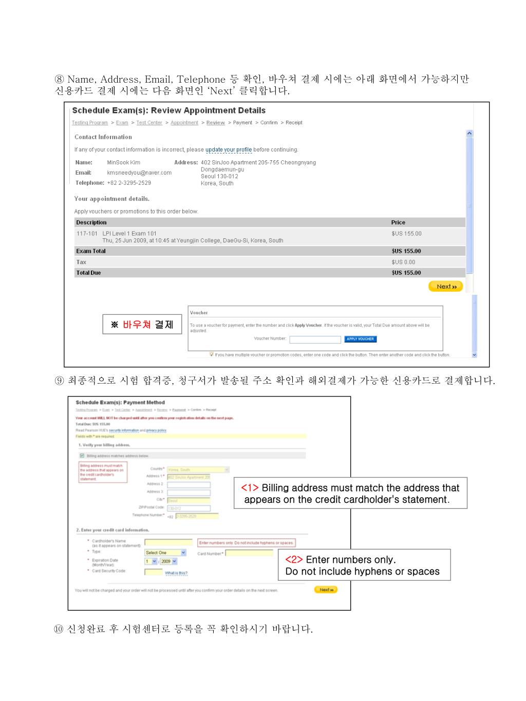 <1>Billing address must match the address that appears on the credit cardholder's statement. <2>Enter numbers only. Do not include hyphens or spaces ⑧ Name, Address, Email, Telephone 등 확인, 바우쳐 결제 시에는 아래 화면에서 가능하지만 신용카드 결제 시에는 다음 화면인 ‘Next’ 클릭합니다. ※ 바우쳐 결제 ⑨ 최종적으로 시험 합격증, 청구서가 발송될 주소 확인과 해외결제가 가능한 신용카드로 결제합니다. ⑩ 신청완료 후 시험센터로 등록을 꼭 확인하시기 바랍니다.
