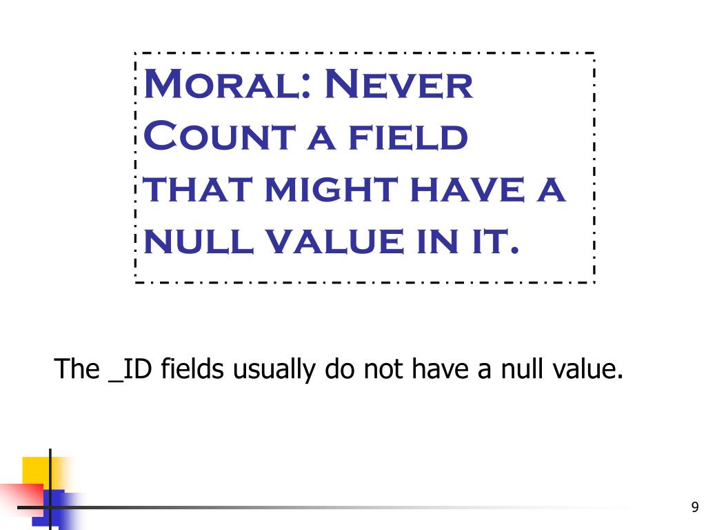 Null is… … different from blank … different from zero Null means that the value has not been filled in. And null fields are not counted with the Count function!