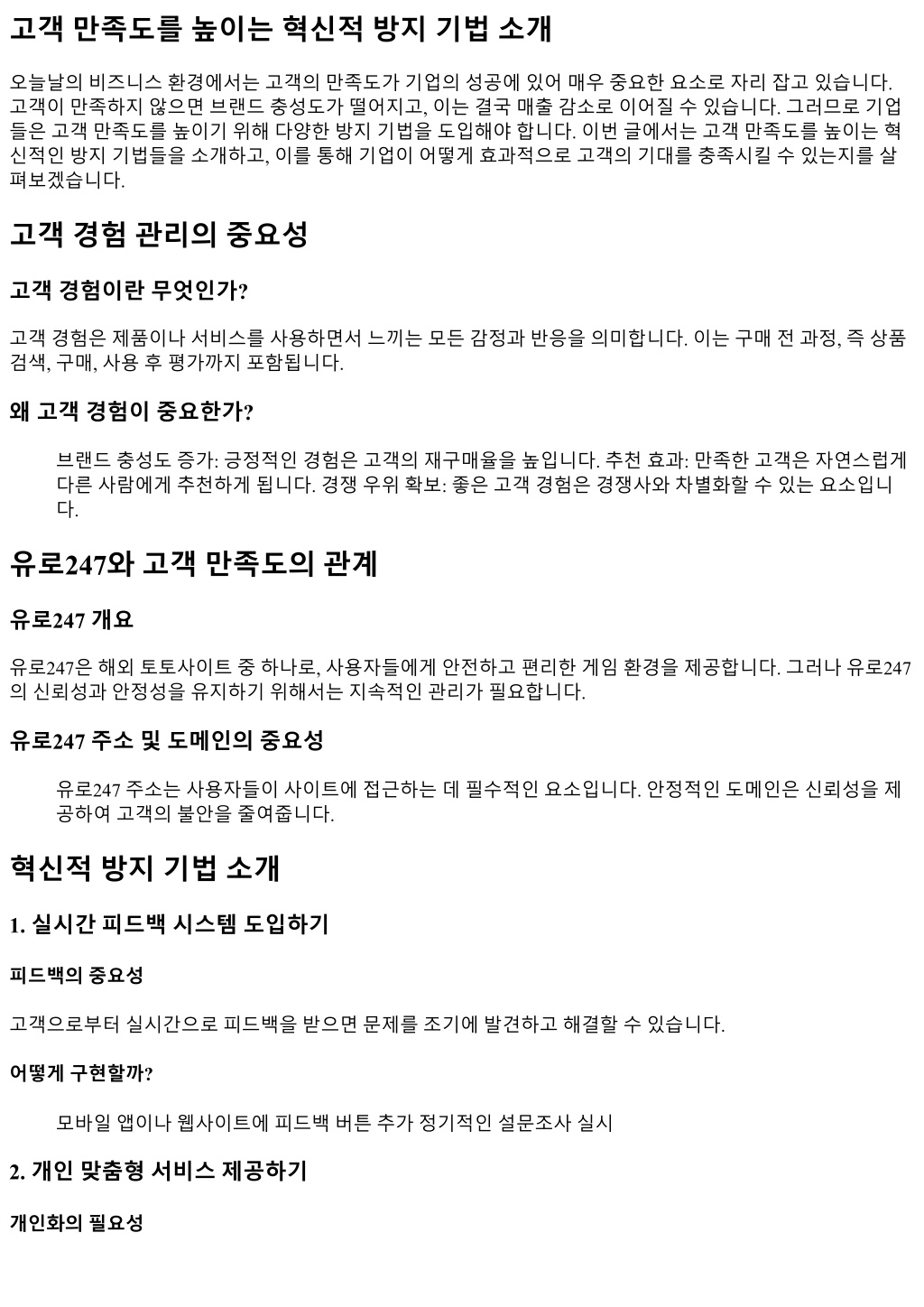 고객만족도를높이는혁신적방지기법소개 오늘날의비즈니스환경에서는고객의만족도가기업의성공에있어매우중요한요소로자리잡고있습니다. 고객이만족하지않으면브랜드충성도가떨어지고, 이는결국매출감소로이어질수있습니다. 그러므로기업 들은고객만족도를높이기위해다양한방지기법을도입해야합니다. 이번글에서는고객만족도를높이는혁 신적인방지기법들을소개하고, 이를통해기업이어떻게효과적으로고객의기대를충족시킬수있는지를살 펴보겠습니다. 고객경험관리의중요성 고객경험이란무엇인가? 고객경험은제품이나서비스를사용하면서느끼는모든감정과반응을의미합니다. 이는구매전과정, 즉상품 검색, 구매, 사용후평가까지포함됩니다. 왜고객경험이중요한가? 브랜드충성도증가: 긍정적인경험은고객의재구매율을높입니다. 추천효과: 만족한고객은자연스럽게 다른사람에게추천하게됩니다. 경쟁우위확보: 좋은고객경험은경쟁사와차별화할수있는요소입니 다. 유로247와고객만족도의관계 유로247 개요 유로247은해외토토사이트중하나로, 사용자들에게안전하고편리한게임환경을제공합니다. 그러나유로247 의신뢰성과안정성을유지하기위해서는지속적인관리가필요합니다. 유로247 주소및도메인의중요성 유로247 주소는사용자들이사이트에접근하는데필수적인요소입니다. 안정적인도메인은신뢰성을제 공하여고객의불안을줄여줍니다. 혁신적방지기법소개 1. 실시간피드백시스템도입하기 피드백의중요성 고객으로부터실시간으로피드백을받으면문제를조기에발견하고해결할수있습니다. 어떻게구현할까? 모바일앱이나웹사이트에피드백버튼추가정기적인설문조사실시 2. 개인맞춤형서비스제공하기 개인화의필요성