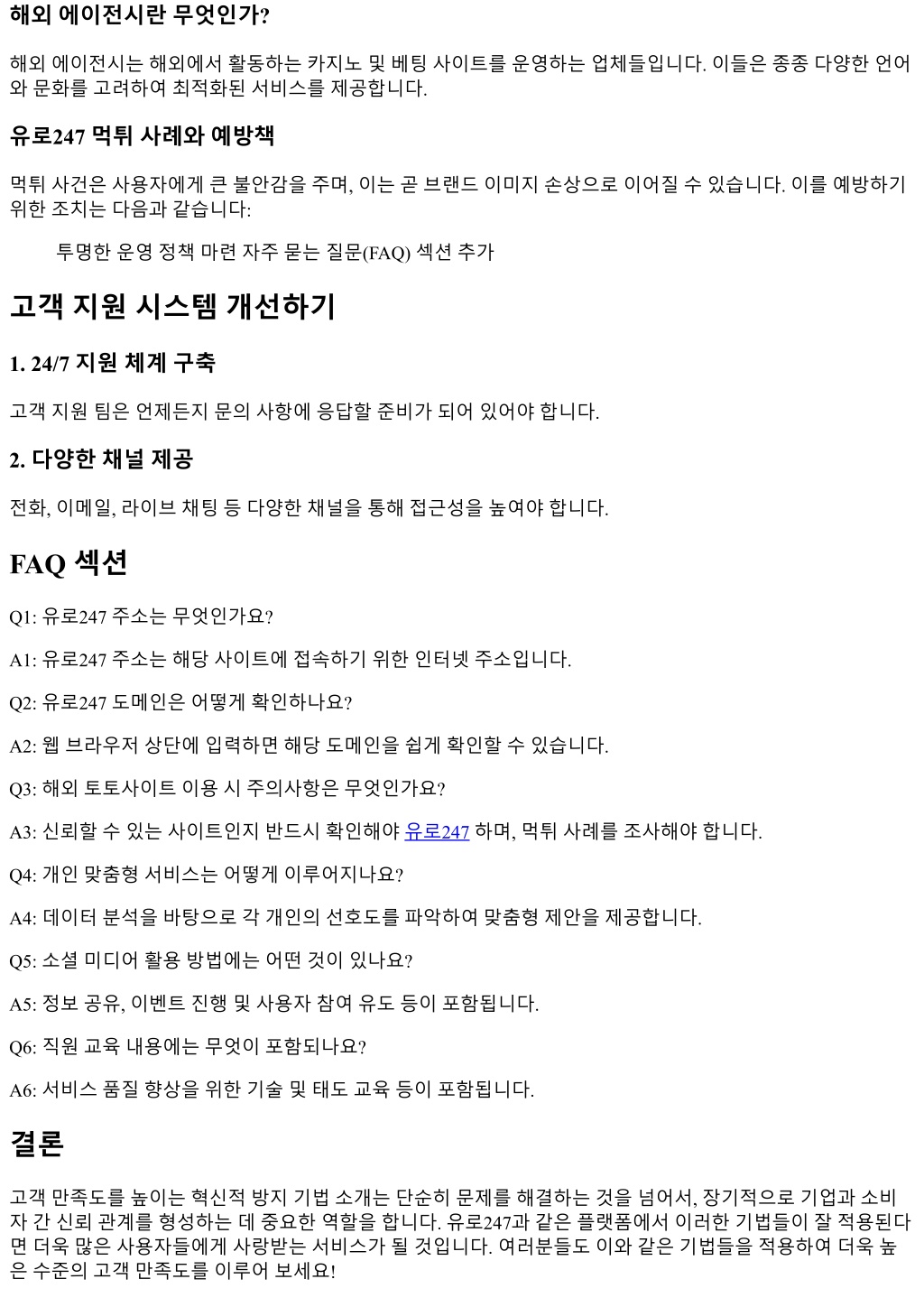 해외에이전시란무엇인가? 해외에이전시는해외에서활동하는카지노및베팅사이트를운영하는업체들입니다. 이들은종종다양한언어 와문화를고려하여최적화된서비스를제공합니다. 유로247 먹튀사례와예방책 먹튀사건은사용자에게큰불안감을주며, 이는곧브랜드이미지손상으로이어질수있습니다. 이를예방하기 위한조치는다음과같습니다: 투명한운영정책마련자주묻는질문(FAQ) 섹션추가 고객지원시스템개선하기 1. 24/7 지원체계구축 고객지원팀은언제든지문의사항에응답할준비가되어있어야합니다. 2. 다양한채널제공 전화, 이메일, 라이브채팅등다양한채널을통해접근성을높여야합니다. FAQ 섹션 Q1: 유로247 주소는무엇인가요? A1: 유로247 주소는해당사이트에접속하기위한인터넷주소입니다. Q2: 유로247 도메인은어떻게확인하나요? A2: 웹브라우저상단에입력하면해당도메인을쉽게확인할수있습니다. Q3: 해외토토사이트이용시주의사항은무엇인가요? A3: 신뢰할수있는사이트인지반드시확인해야유로247하며, 먹튀사례를조사해야합니다. Q4: 개인맞춤형서비스는어떻게이루어지나요? A4: 데이터분석을바탕으로각개인의선호도를파악하여맞춤형제안을제공합니다. Q5: 소셜미디어활용방법에는어떤것이있나요? A5: 정보공유, 이벤트진행및사용자참여유도등이포함됩니다. Q6: 직원교육내용에는무엇이포함되나요? A6: 서비스품질향상을위한기술및태도교육등이포함됩니다. 결론 고객만족도를높이는혁신적방지기법소개는단순히문제를해결하는것을넘어서, 장기적으로기업과소비 자간신뢰관계를형성하는데중요한역할을합니다. 유로247과같은플랫폼에서이러한기법들이잘적용된다 면더욱많은사용자들에게사랑받는서비스가될것입니다. 여러분들도이와같은기법들을적용하여더욱높 은수준의고객만족도를이루어보세요!
