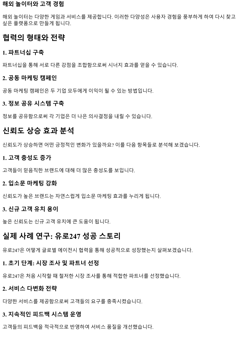 해외놀이터와고객경험 해외놀이터는다양한게임과서비스를제공합니다. 이러한다양성은사용자경험을풍부하게하여다시찾고 싶은플랫폼으로만들게됩니다. 협력의형태와전략 1. 파트너십구축 파트너십을통해서로다른강점을조합함으로써시너지효과를얻을수있습니다. 2. 공동마케팅캠페인 공동마케팅캠페인은두기업모두에게이익이될수있는방법입니다. 3. 정보공유시스템구축 정보를공유함으로써각기업은더나은의사결정을내릴수있습니다. 신뢰도상승효과분석 신뢰도가상승하면어떤긍정적인변화가있을까요? 이를다음항목들로분석해보겠습니다. 1. 고객충성도증가 고객들이믿음직한브랜드에대해더많은충성도를보입니다. 2. 입소문마케팅강화 신뢰도가높은브랜드는자연스럽게입소문마케팅효과를누리게됩니다. 3. 신규고객유치용이 높은신뢰도는신규고객유치에큰도움이됩니다. 실제사례연구: 유로247 성공스토리 유로247은어떻게글로벌에이전시협력을통해성공적으로성장했는지살펴보겠습니다. 1. 초기단계: 시장조사및파트너선정 유로247은처음시작할때철저한시장조사를통해적합한파트너를선정했습니다. 2. 서비스다변화전략 다양한서비스를제공함으로써고객들의요구를충족시켰습니다. 3. 지속적인피드백시스템운영 고객들의피드백을적극적으로반영하여서비스품질을개선했습니다.