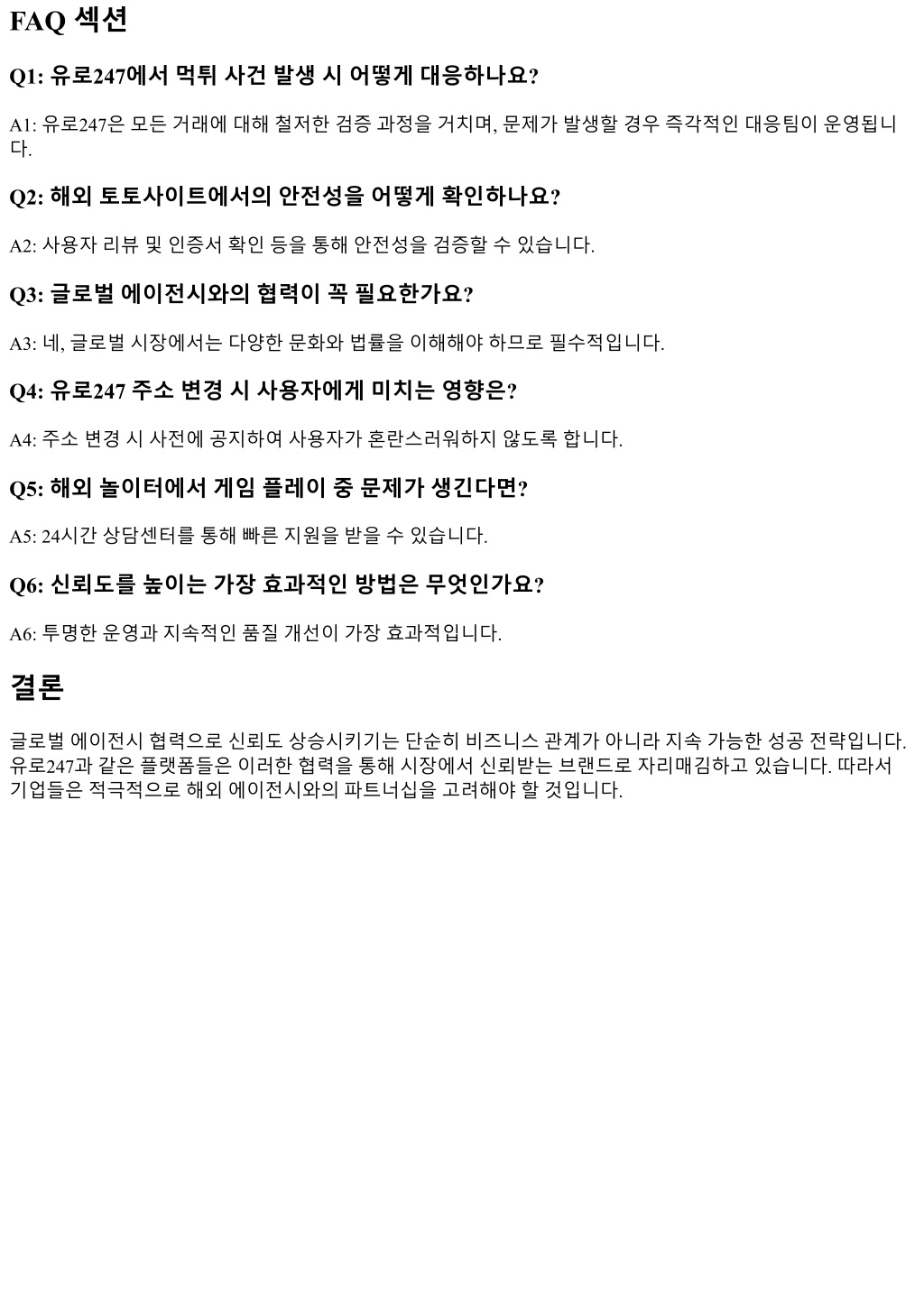 FAQ 섹션 Q1: 유로247에서먹튀사건발생시어떻게대응하나요? A1: 유로247은모든거래에대해철저한검증과정을거치며, 문제가발생할경우즉각적인대응팀이운영됩니 다. Q2: 해외토토사이트에서의안전성을어떻게확인하나요? A2: 사용자리뷰및인증서확인등을통해안전성을검증할수있습니다. Q3: 글로벌에이전시와의협력이꼭필요한가요? A3: 네, 글로벌시장에서는다양한문화와법률을이해해야하므로필수적입니다. Q4: 유로247 주소변경시사용자에게미치는영향은? A4: 주소변경시사전에공지하여사용자가혼란스러워하지않도록합니다. Q5: 해외놀이터에서게임플레이중문제가생긴다면? A5: 24시간상담센터를통해빠른지원을받을수있습니다. Q6: 신뢰도를높이는가장효과적인방법은무엇인가요? A6: 투명한운영과지속적인품질개선이가장효과적입니다. 결론 글로벌에이전시협력으로신뢰도상승시키기는단순히비즈니스관계가아니라지속가능한성공전략입니다. 유로247과같은플랫폼들은이러한협력을통해시장에서신뢰받는브랜드로자리매김하고있습니다. 따라서 기업들은적극적으로해외에이전시와의파트너십을고려해야할것입니다.