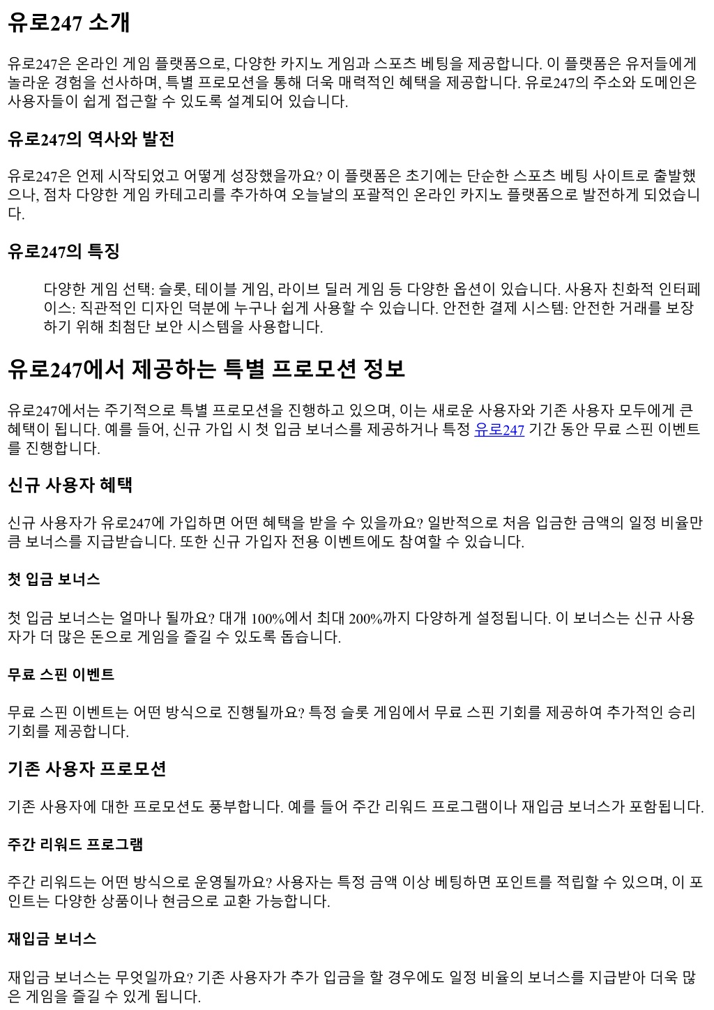 유로247 소개 유로247은온라인게임플랫폼으로, 다양한카지노게임과스포츠베팅을제공합니다. 이플랫폼은유저들에게 놀라운경험을선사하며, 특별프로모션을통해더욱매력적인혜택을제공합니다. 유로247의주소와도메인은 사용자들이쉽게접근할수있도록설계되어있습니다. 유로247의역사와발전 유로247은언제시작되었고어떻게성장했을까요? 이플랫폼은초기에는단순한스포츠베팅사이트로출발했 으나, 점차다양한게임카테고리를추가하여오늘날의포괄적인온라인카지노플랫폼으로발전하게되었습니 다. 유로247의특징 다양한게임선택: 슬롯, 테이블게임, 라이브딜러게임등다양한옵션이있습니다. 사용자친화적인터페 이스: 직관적인디자인덕분에누구나쉽게사용할수있습니다. 안전한결제시스템: 안전한거래를보장 하기위해최첨단보안시스템을사용합니다. 유로247에서제공하는특별프로모션정보 유로247에서는주기적으로특별프로모션을진행하고있으며, 이는새로운사용자와기존사용자모두에게큰 혜택이됩니다. 예를들어, 신규가입시첫입금보너스를제공하거나특정유로247기간동안무료스핀이벤트 를진행합니다. 신규사용자혜택 신규사용자가유로247에가입하면어떤혜택을받을수있을까요? 일반적으로처음입금한금액의일정비율만 큼보너스를지급받습니다. 또한신규가입자전용이벤트에도참여할수있습니다. 첫입금보너스 첫입금보너스는얼마나될까요? 대개 100%에서최대 200%까지다양하게설정됩니다. 이보너스는신규사용 자가더많은돈으로게임을즐길수있도록돕습니다. 무료스핀이벤트 무료스핀이벤트는어떤방식으로진행될까요? 특정슬롯게임에서무료스핀기회를제공하여추가적인승리 기회를제공합니다. 기존사용자프로모션 기존사용자에대한프로모션도풍부합니다. 예를들어주간리워드프로그램이나재입금보너스가포함됩니다. 주간리워드프로그램 주간리워드는어떤방식으로운영될까요? 사용자는특정금액이상베팅하면포인트를적립할수있으며, 이포 인트는다양한상품이나현금으로교환가능합니다. 재입금보너스 재입금보너스는무엇일까요? 기존사용자가추가입금을할경우에도일정비율의보너스를지급받아더욱많 은게임을즐길수있게됩니다.
