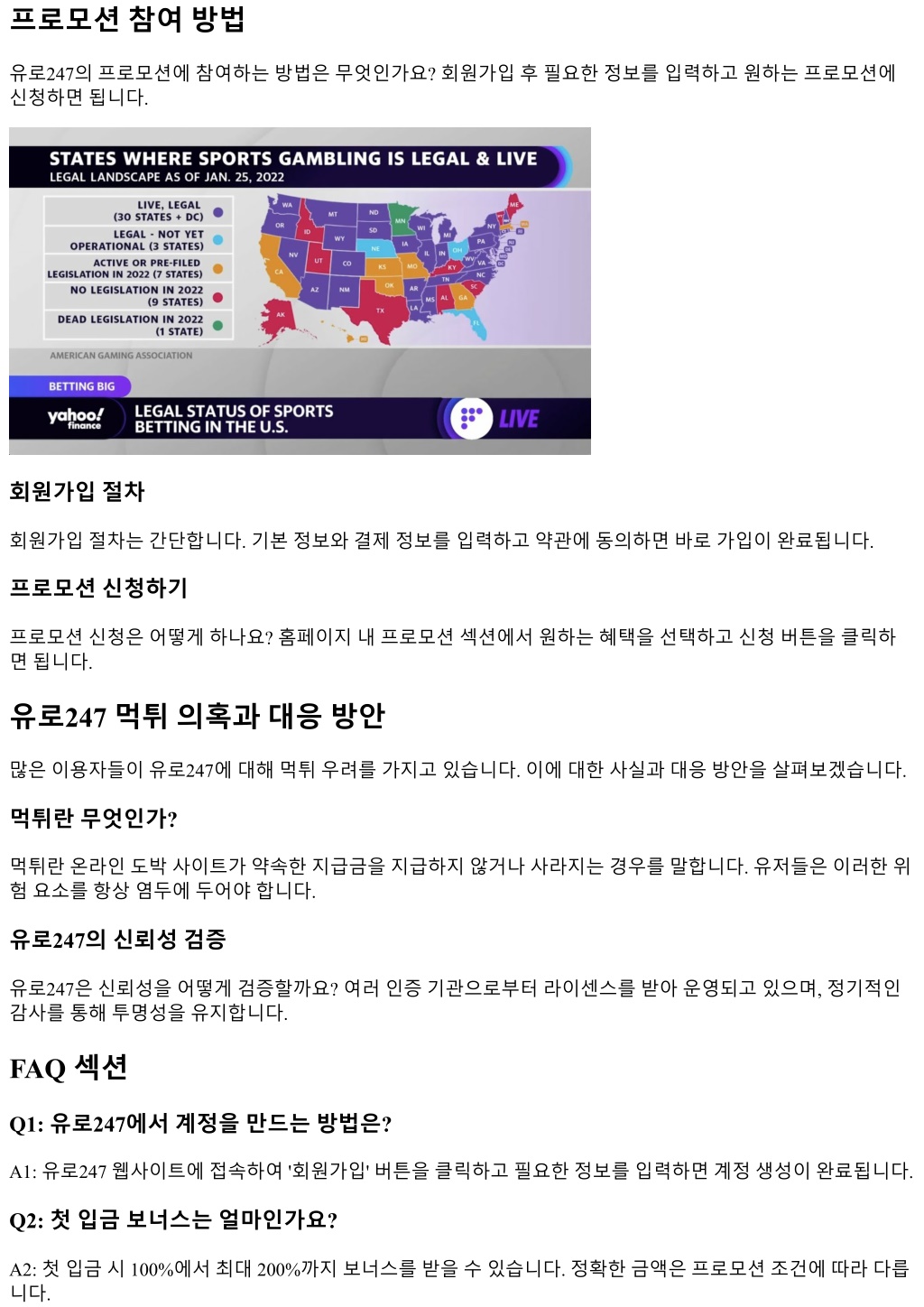 프로모션참여방법 유로247의프로모션에참여하는방법은무엇인가요? 회원가입후필요한정보를입력하고원하는프로모션에 신청하면됩니다. 회원가입절차 회원가입절차는간단합니다. 기본정보와결제정보를입력하고약관에동의하면바로가입이완료됩니다. 프로모션신청하기 프로모션신청은어떻게하나요? 홈페이지내프로모션섹션에서원하는혜택을선택하고신청버튼을클릭하 면됩니다. 유로247 먹튀의혹과대응방안 많은이용자들이유로247에대해먹튀우려를가지고있습니다. 이에대한사실과대응방안을살펴보겠습니다. 먹튀란무엇인가? 먹튀란온라인도박사이트가약속한지급금을지급하지않거나사라지는경우를말합니다. 유저들은이러한위 험요소를항상염두에두어야합니다. 유로247의신뢰성검증 유로247은신뢰성을어떻게검증할까요? 여러인증기관으로부터라이센스를받아운영되고있으며, 정기적인 감사를통해투명성을유지합니다. FAQ 섹션 Q1: 유로247에서계정을만드는방법은? A1: 유로247 웹사이트에접속하여 '회원가입' 버튼을클릭하고필요한정보를입력하면계정생성이완료됩니다. Q2: 첫입금보너스는얼마인가요? A2: 첫입금시 100%에서최대 200%까지보너스를받을수있습니다. 정확한금액은프로모션조건에따라다릅 니다.