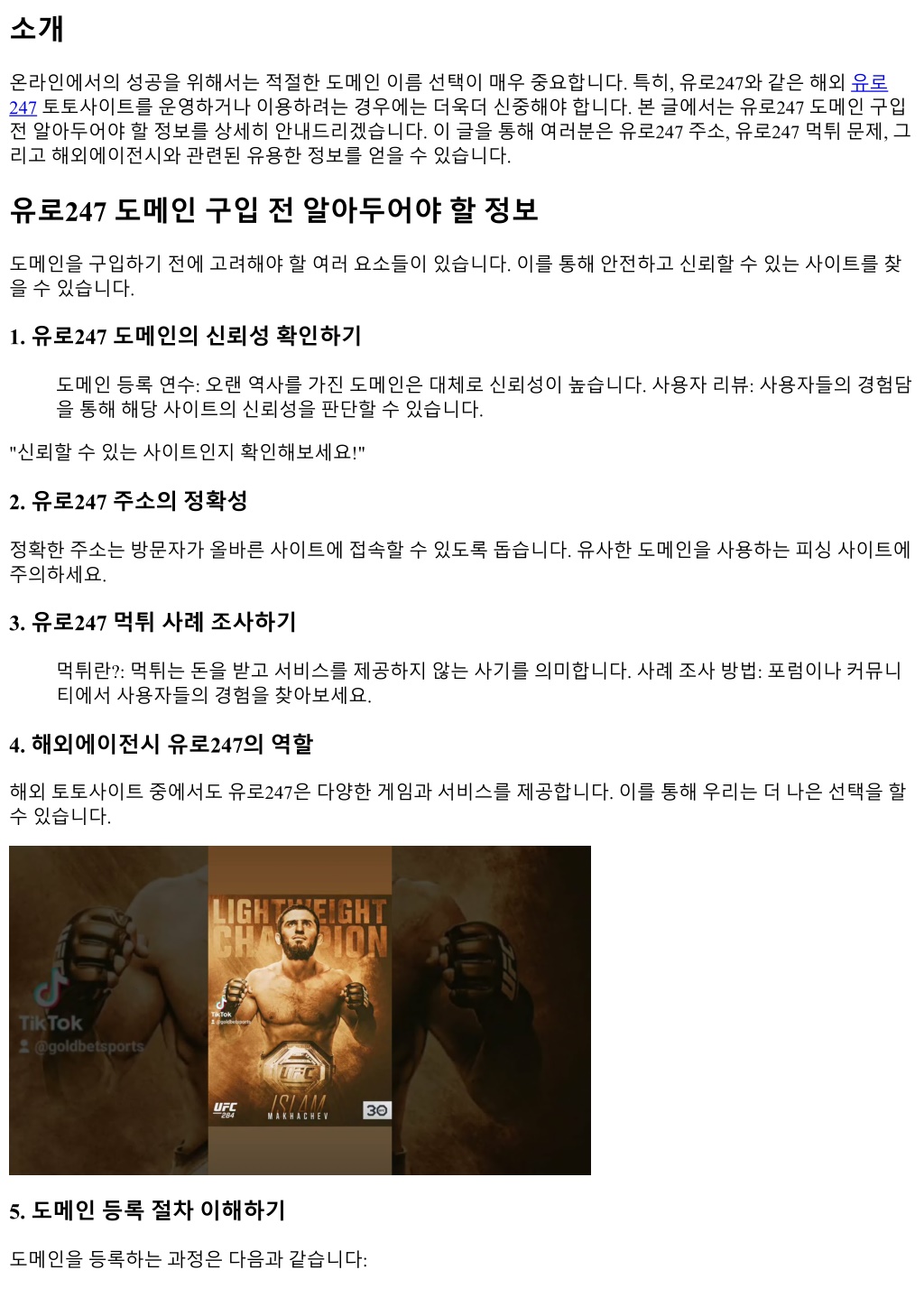 소개 온라인에서의성공을위해서는적절한도메인이름선택이매우중요합니다. 특히, 유로247와같은해외유로 247토토사이트를운영하거나이용하려는경우에는더욱더신중해야합니다. 본글에서는유로247 도메인구입 전알아두어야할정보를상세히안내드리겠습니다. 이글을통해여러분은유로247 주소, 유로247 먹튀문제, 그 리고해외에이전시와관련된유용한정보를얻을수있습니다. 유로247 도메인구입전알아두어야할정보 도메인을구입하기전에고려해야할여러요소들이있습니다. 이를통해안전하고신뢰할수있는사이트를찾 을수있습니다. 1. 유로247 도메인의신뢰성확인하기 도메인등록연수: 오랜역사를가진도메인은대체로신뢰성이높습니다. 사용자리뷰: 사용자들의경험담 을통해해당사이트의신뢰성을판단할수있습니다. "신뢰할수있는사이트인지확인해보세요!" 2. 유로247 주소의정확성 정확한주소는방문자가올바른사이트에접속할수있도록돕습니다. 유사한도메인을사용하는피싱사이트에 주의하세요. 3. 유로247 먹튀사례조사하기 먹튀란?: 먹튀는돈을받고서비스를제공하지않는사기를의미합니다. 사례조사방법: 포럼이나커뮤니 티에서사용자들의경험을찾아보세요. 4. 해외에이전시유로247의역할 해외토토사이트중에서도유로247은다양한게임과서비스를제공합니다. 이를통해우리는더나은선택을할 수있습니다. 5. 도메인등록절차이해하기 도메인을등록하는과정은다음과같습니다: