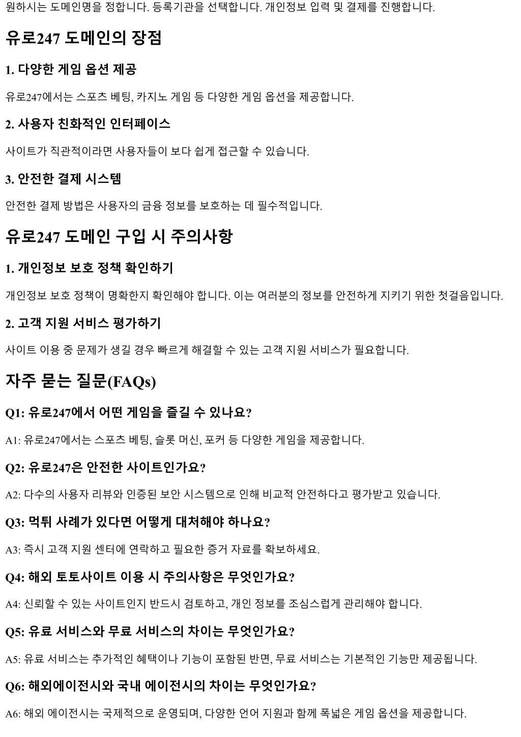원하시는도메인명을정합니다. 등록기관을선택합니다. 개인정보입력및결제를진행합니다. 유로247 도메인의장점 1. 다양한게임옵션제공 유로247에서는스포츠베팅, 카지노게임등다양한게임옵션을제공합니다. 2. 사용자친화적인인터페이스 사이트가직관적이라면사용자들이보다쉽게접근할수있습니다. 3. 안전한결제시스템 안전한결제방법은사용자의금융정보를보호하는데필수적입니다. 유로247 도메인구입시주의사항 1. 개인정보보호정책확인하기 개인정보보호정책이명확한지확인해야합니다. 이는여러분의정보를안전하게지키기위한첫걸음입니다. 2. 고객지원서비스평가하기 사이트이용중문제가생길경우빠르게해결할수있는고객지원서비스가필요합니다. 자주묻는질문(FAQs) Q1: 유로247에서어떤게임을즐길수있나요? A1: 유로247에서는스포츠베팅, 슬롯머신, 포커등다양한게임을제공합니다. Q2: 유로247은안전한사이트인가요? A2: 다수의사용자리뷰와인증된보안시스템으로인해비교적안전하다고평가받고있습니다. Q3: 먹튀사례가있다면어떻게대처해야하나요? A3: 즉시고객지원센터에연락하고필요한증거자료를확보하세요. Q4: 해외토토사이트이용시주의사항은무엇인가요? A4: 신뢰할수있는사이트인지반드시검토하고, 개인정보를조심스럽게관리해야합니다. Q5: 유료서비스와무료서비스의차이는무엇인가요? A5: 유료서비스는추가적인혜택이나기능이포함된반면, 무료서비스는기본적인기능만제공됩니다. Q6: 해외에이전시와국내에이전시의차이는무엇인가요? A6: 해외에이전시는국제적으로운영되며, 다양한언어지원과함께폭넓은게임옵션을제공합니다.