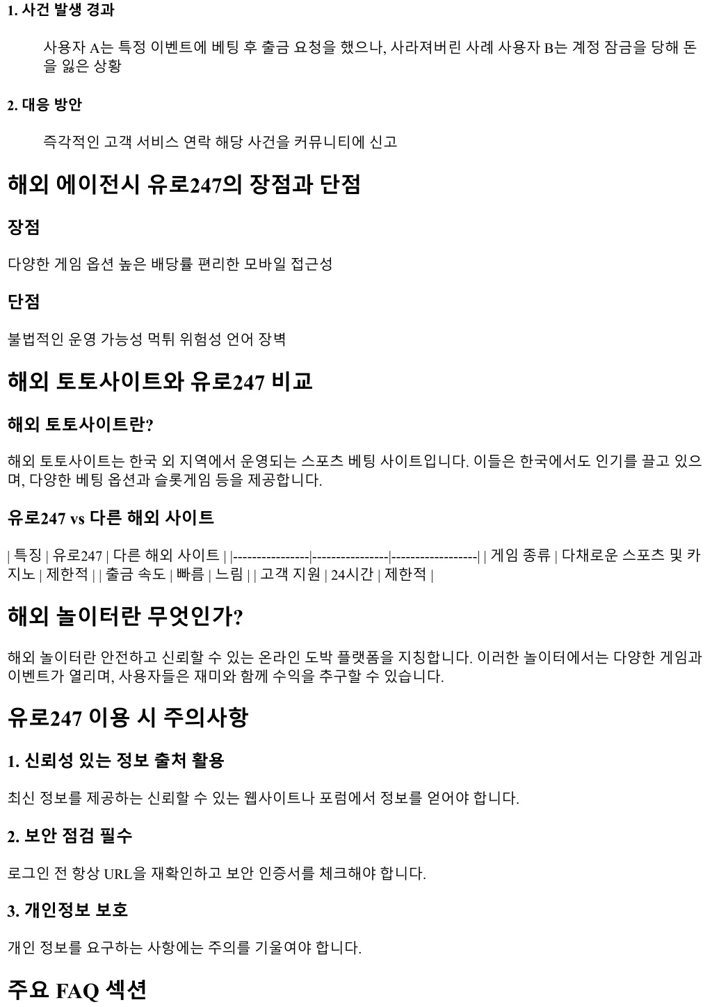 Q1: 유로247 먹튀사건은얼마나자주발생하나요? A1: 특정통계는없지만, 일부사용자들사이에서는간헐적으로발생한다고보고되고있습니다. Q2: 정확한유로247 주소는어디서찾나요? A2: 공식웹사이트나소셜미디어채널에서최신정보를찾아볼수있습니다. Q3: 해외토토사이트이용시법적문제는없나요? A3: 각국가별법률이다르므로해당법률을반드시숙지해야합니다. Q4: 고객지원은어떻게받을수있나요? A4: 대부분의해외토토사이트는이메일또는라이브챗서비스를제공합니다. Q5: 모바일에서도이용가능한가요? A5: 네, 대부분의해외에이전시들은모바일에서도최적화된서비스를제공합니다. Q6: 추천하는다른해외놀이터는무엇인가요? A6: 여러사이트가있지만, 항상안전성을먼저고려해야합니다. 결론 정확한유로247 주소확인하기는안전하고즐거운온라인도박경험을위해필수입니다. 잘못된정보에의존하 지말고항상공식경로나신뢰할수있는커뮤니티를통해정보를얻도록하세요. 다양한경험들을통해보다나 은선택을할수있을것입니다!
