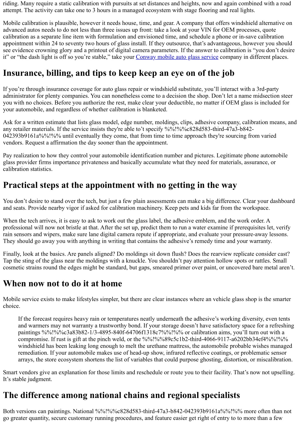 riding. Many require a static calibration with pursuits at set distances and heights, now and again combined with a road attempt. The activity can take one to 3 hours in a managed ecosystem with stage flooring and real lights. Mobile calibration is plausible, however it needs house, time, and gear. A company that offers windshield alternative on advanced autos needs to do not less than three issues up front: take a look at your VIN for OEM processes, quote calibration as a separate line item with formulation and envisioned time, and schedule a phone or in-save calibration appointment within 24 to seventy two hours of glass install. If they outsource, that’s advantageous, however you should see evidence crowning glory and a printout of digital camera parameters. If the answer to calibration is “you don’t desire it” or “the dash light is off so you’re stable,” take your Conway mobile auto glass service company in different places. Insurance, billing, and tips to keep keep an eye on of the job If you’re through insurance coverage for auto glass repair or windshield substitute, you’ll interact with a 3rd-party administrator for plenty companies. You can nonetheless come to a decision the shop. Don’t let a name midsection steer you with no choices. Before you authorize the rest, make clear your deductible, no matter if OEM glass is included for your automobile, and regardless of whether calibration is blanketed. Ask for a written estimate that lists glass model, edge number, moldings, clips, adhesive company, calibration means, and any retailer materials. If the service insists they're able to’t specify %%!%%c828d583-third-47a3-b842- 042393b9161a%%!%% until eventually they come, that from time to time approach they're sourcing from varied vendors. Request a affirmation the day sooner than the appointment. Pay realization to how they control your automobile identification number and pictures. Legitimate phone automobile glass provider firms importance privateness and basically accumulate what they need for materials, assurance, or calibration statistics. Practical steps at the appointment with no getting in the way You don’t desire to stand over the tech, but just a few plain assessments can make a big difference. Clear your dashboard and seats. Provide nearby vigor if asked for calibration machinery. Keep pets and kids far from the workspace. When the tech arrives, it is easy to ask to work out the glass label, the adhesive emblem, and the work order. A professional will now not bristle at that. After the set up, predict them to run a water examine if prerequisites let, verify rain sensors and wipers, make sure lane digital camera repute if appropriate, and evaluate your pressure-away lessons. They should go away you with anything in writing that contains the adhesive’s remedy time and your warranty. Finally, look at the basics. Are panels aligned? Do moldings sit down flush? Does the rearview replicate consider cast? Tap the sting of the glass near the moldings with a knuckle. You shouldn’t pay attention hollow spots or rattles. Small cosmetic strains round the edges might be standard, but gaps, smeared primer over paint, or uncovered bare metal aren’t. When now not to do it at home Mobile service exists to make lifestyles simpler, but there are clear instances where an vehicle glass shop is the smarter choice. If the forecast requires heavy rain or temperatures neatly underneath the adhesive’s working diversity, even tents and warmers may not warranty a trustworthy bond. If your storage doesn’t have satisfactory space for a refreshing paintings %%!%%c3a83b82-1/3-4895-840f-64706f1318c7%%!%% or calibration aims, you’ll turn out with a compromise. If rust is gift at the pinch weld, or the %%!%%89c5c1b2-third-4066-9117-a6202bb34ef4%%!%% windshield has been leaking long enough to melt the urethane mattress, the automobile probable wishes managed remediation. If your automobile makes use of head-up show, infrared reflective coatings, or problematic sensor arrays, the store ecosystem shortens the list of variables that could purpose ghosting, distortion, or miscalibration. Smart vendors give an explanation for those limits and reschedule or route you to their facility. That’s now not upselling. It’s stable judgment. The difference among national chains and regional specialists Both versions can paintings. National %%!%%c828d583-third-47a3-b842-042393b9161a%%!%% more often than not go greater quantity, secure customary running procedures, and feature easier get right of entry to to more than a few