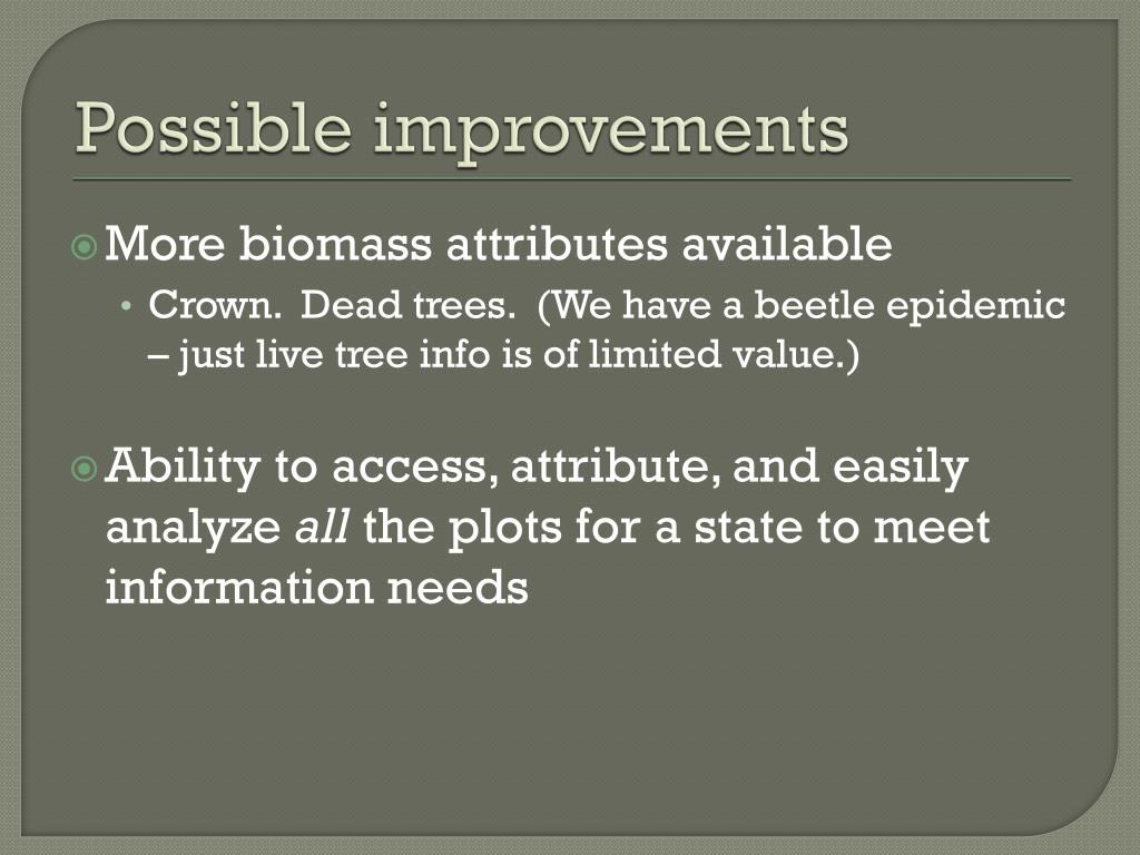 Possible improvements • More biomass attributes available • Crown. Dead trees. (We have a beetle epidemic – just live tree info is of limited value.) • Ability to access, attribute, and easily analyze all the plots for a state to meet information needs