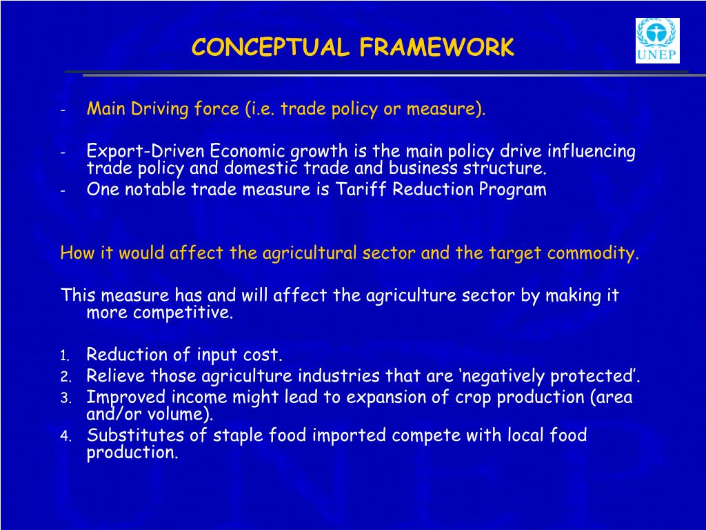 CONCEPTUAL FRAMEWORK • Main Driving force (i.e. trade policy or measure). • Export-Driven Economic growth is the main policy drive influencing trade policy and domestic trade and business structure. • One notable trade measure is Tariff Reduction Program How it would affect the agricultural sector and the target commodity. This measure has and will affect the agriculture sector by making it more competitive. • Reduction of input cost. • Relieve those agriculture industries that are ‘negatively protected’. • Improved income might lead to expansion of crop production (area and/or volume). • Substitutes of staple food imported compete with local food production.
