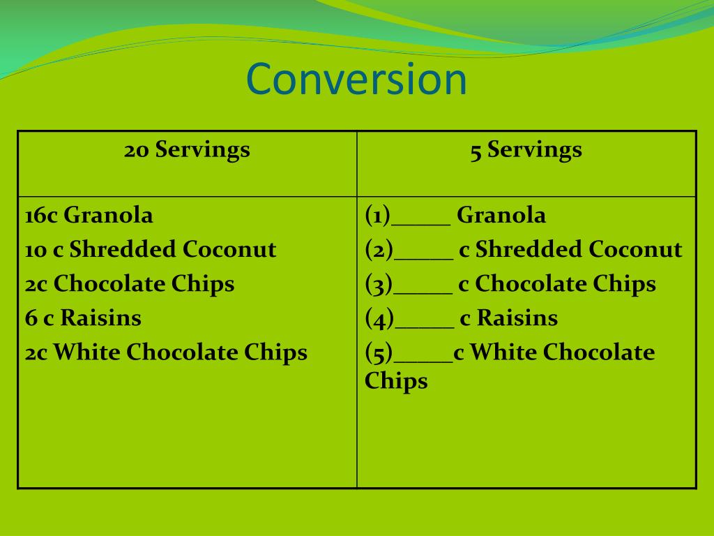 Factor Method (most common) • Determine the “factor” to be used • Desired yield / Current yield = Factor • Multiply each ingredient quantity by the “factor” • Original amount X Factor = Amount needed • Change amounts into more common measurements • 1.25 cups = 1 ¼ cup