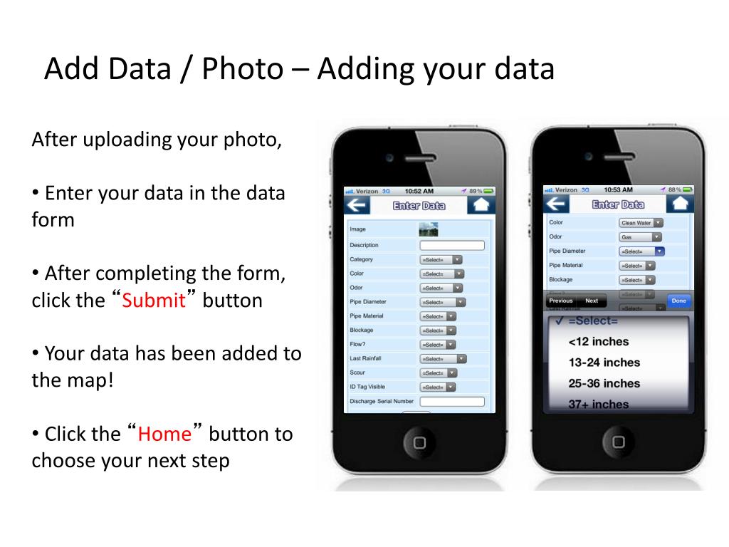 Add Data / Photo – Adding your data • After uploading your photo, • Enter your data in the data form • After completing the form, click the “Submit” button • Your data has been added to the map! • Click the “Home” button to choose your next step