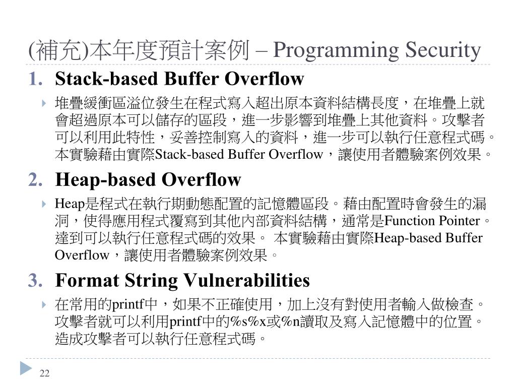 (補充)本年度預計案例 – Programming Security • Stack-based Buffer Overflow • 堆疊緩衝區溢位發生在程式寫入超出原本資料結構長度,在堆疊上就會超過原本可以儲存的區段,進一步影響到堆疊上其他資料。攻擊者可以利用此特性,妥善控制寫入的資料,進一步可以執行任意程式碼。本實驗藉由實際Stack-based Buffer Overflow,讓使用者體驗案例效果。 • Heap-based Overflow • Heap是程式在執行期動態配置的記憶體區段。藉由配置時會發生的漏洞,使得應用程式覆寫到其他內部資料結構,通常是Function Pointer。達到可以執行任意程式碼的效果。 本實驗藉由實際Heap-based Buffer Overflow,讓使用者體驗案例效果。 • Format String Vulnerabilities • 在常用的printf中,如果不正確使用,加上沒有對使用者輸入做檢查。攻擊者就可以利用printf中的%s%x或%n讀取及寫入記憶體中的位置。造成攻擊者可以執行任意程式碼。