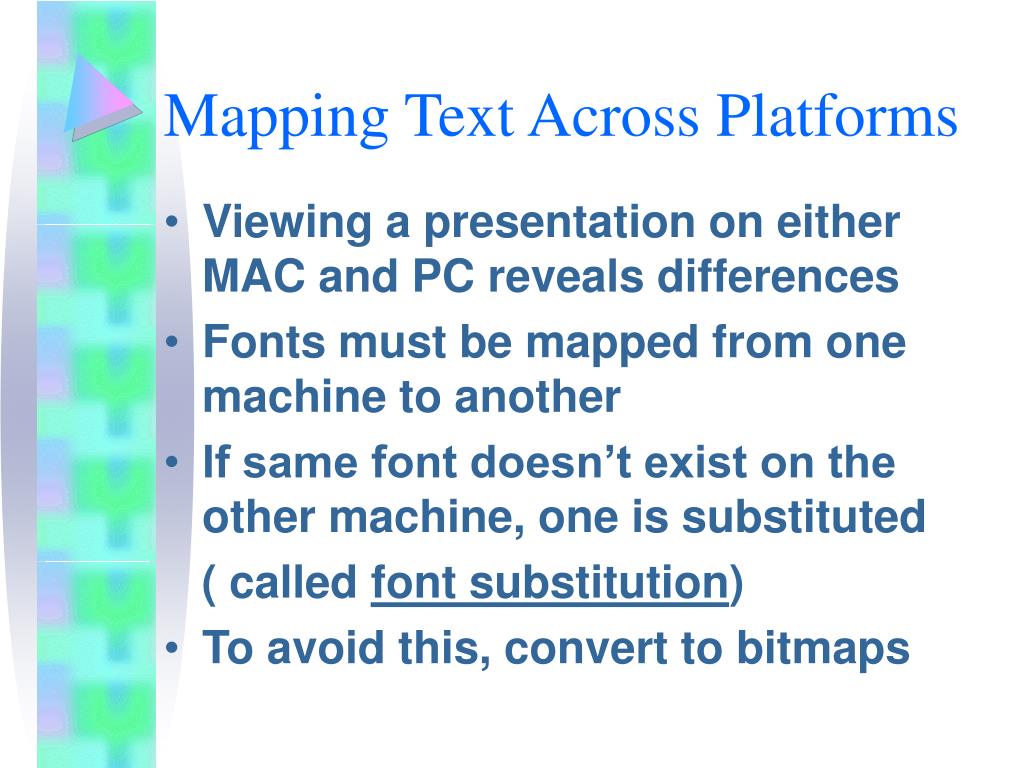 Mapping Text Across Platforms • Viewing a presentation on either MAC and PC reveals differences • Fonts must be mapped from one machine to another • If same font doesn’t exist on the other machine, one is substituted ( called font substitution) • To avoid this, convert to bitmaps