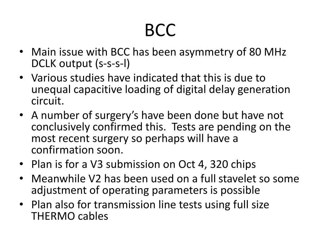 BCC • Main issue with BCC has been asymmetry of 80 MHz DCLK output (s-s-s-l) • Various studies have indicated that this is due to unequal capacitive loading of digital delay generation circuit. • A number of surgery’s have been done but have not conclusively confirmed this. Tests are pending on the most recent surgery so perhaps will have a confirmation soon. • Plan is for a V3 submission on Oct 4, 320 chips • Meanwhile V2 has been used on a full stavelet so some adjustment of operating parameters is possible • Plan also for transmission line tests using full size THERMO cables