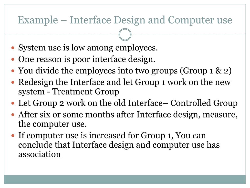 Example – Interface Design and Computer use System use is low among employees. One reason is poor interface design. You divide the employees into two groups (Group 1 & 2) Redesign the Interface and let Group 1 work on the new system - Treatment Group Let Group 2 work on the old Interface– Controlled Group After six or some months after Interface design, measure, the computer use. If computer use is increased for Group 1, You can conclude that Interface design and computer use has association