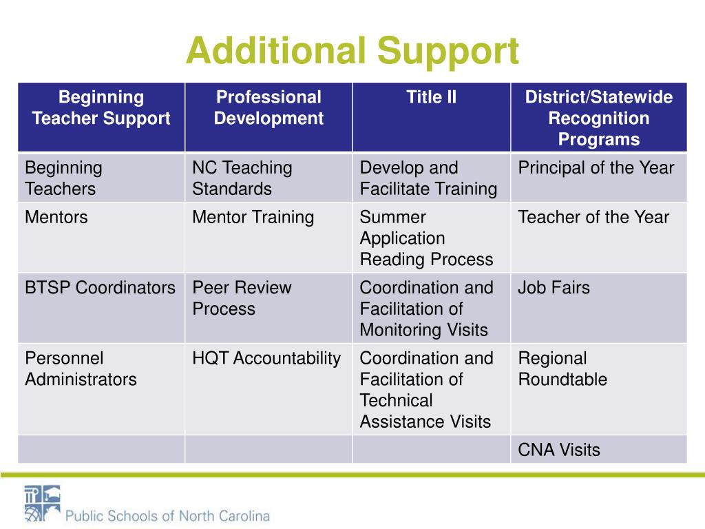 Areas of Support We Provide Improve Student Achievement Professional Development Personnel Administrators BTS Coordinators Beginning Teacher Support Peer Review Process Beginning Teachers Mentors Title II Application Reading Training Creation of Documents Monitoring Visits Technical Assistance Statewide Recognitions Principal of the Year Teacher of the Year