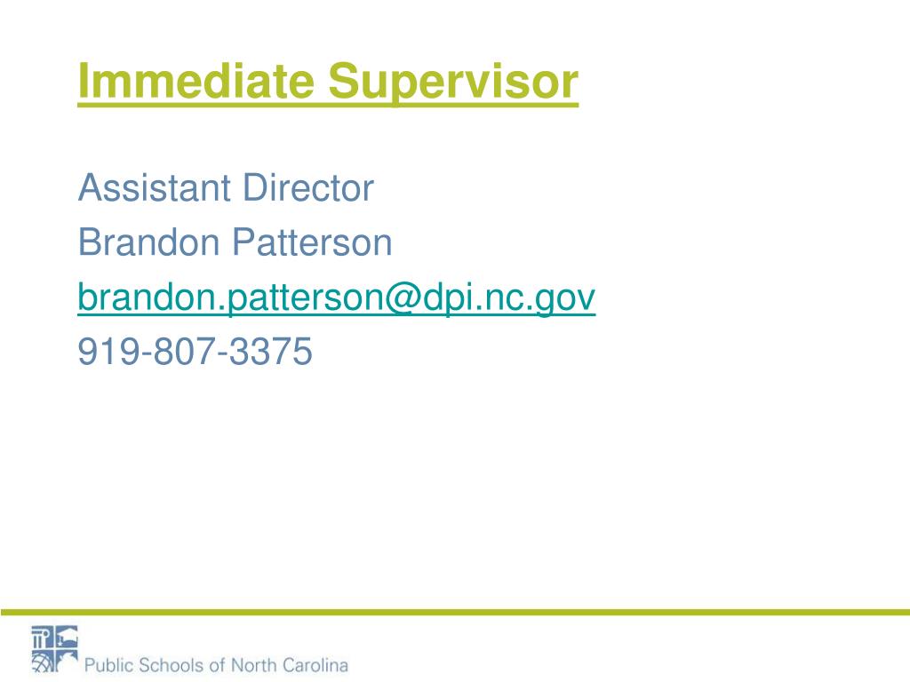 Immediate Supervisor Assistant Director Brandon Patterson brandon.patterson@dpi.nc.gov 919-807-3375
