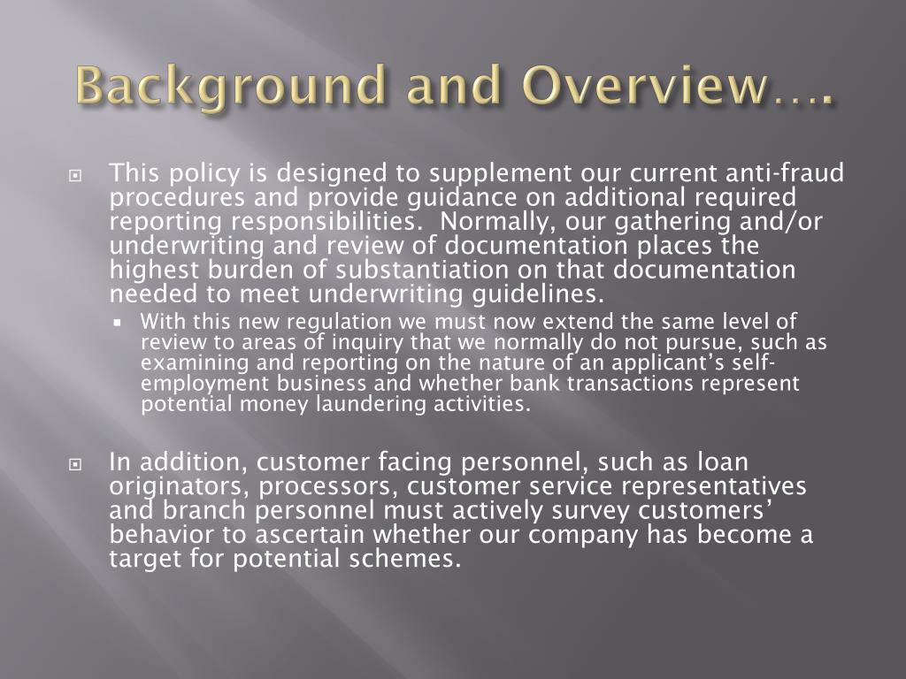 Background and Overview…. • This policy is designed to supplement our current anti-fraud procedures and provide guidance on additional required reporting responsibilities. Normally, our gathering and/or underwriting and review of documentation places the highest burden of substantiation on that documentation needed to meet underwriting guidelines. • With this new regulation we must now extend the same level of review to areas of inquiry that we normally do not pursue, such as examining and reporting on the nature of an applicant’s self-employment business and whether bank transactions represent potential money laundering activities. • In addition, customer facing personnel, such as loan originators, processors, customer service representatives and branch personnel must actively survey customers’ behavior to ascertain whether our company has become a target for potential schemes.