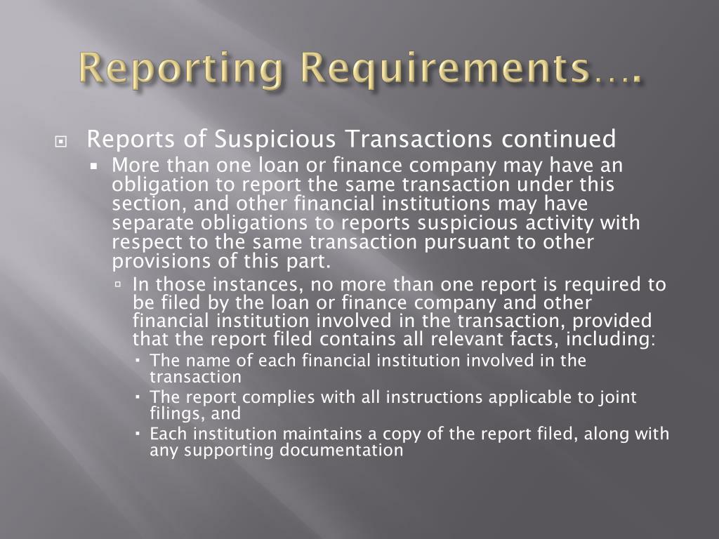 Reporting Requirements…. • Reports of Suspicious Transactions continued • More than one loan or finance company may have an obligation to report the same transaction under this section, and other financial institutions may have separate obligations to reports suspicious activity with respect to the same transaction pursuant to other provisions of this part. • In those instances, no more than one report is required to be filed by the loan or finance company and other financial institution involved in the transaction, provided that the report filed contains all relevant facts, including: • The name of each financial institution involved in the transaction • The report complies with all instructions applicable to joint filings, and • Each institution maintains a copy of the report filed, along with any supporting documentation