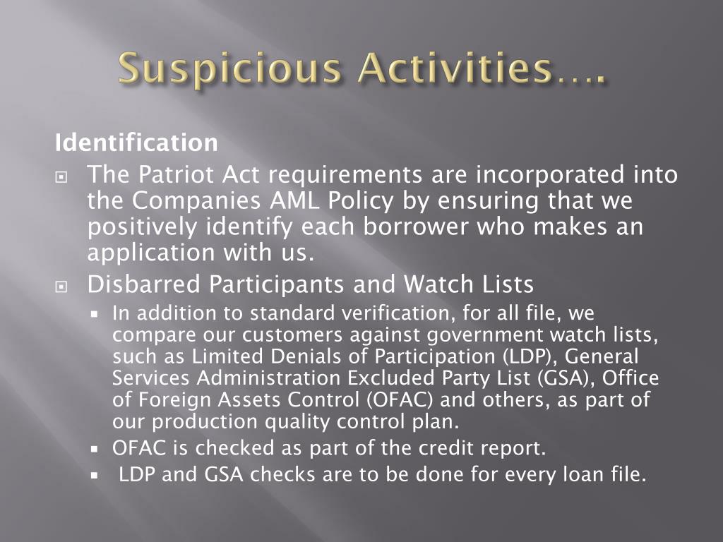 Suspicious Activities…. Identification • The Patriot Act requirements are incorporated into the Companies AML Policy by ensuring that we positively identify each borrower who makes an application with us. • Disbarred Participants and Watch Lists • In addition to standard verification, for all file, we compare our customers against government watch lists, such as Limited Denials of Participation (LDP), General Services Administration Excluded Party List (GSA), Office of Foreign Assets Control (OFAC) and others, as part of our production quality control plan. • OFAC is checked as part of the credit report. • LDP and GSA checks are to be done for every loan file.