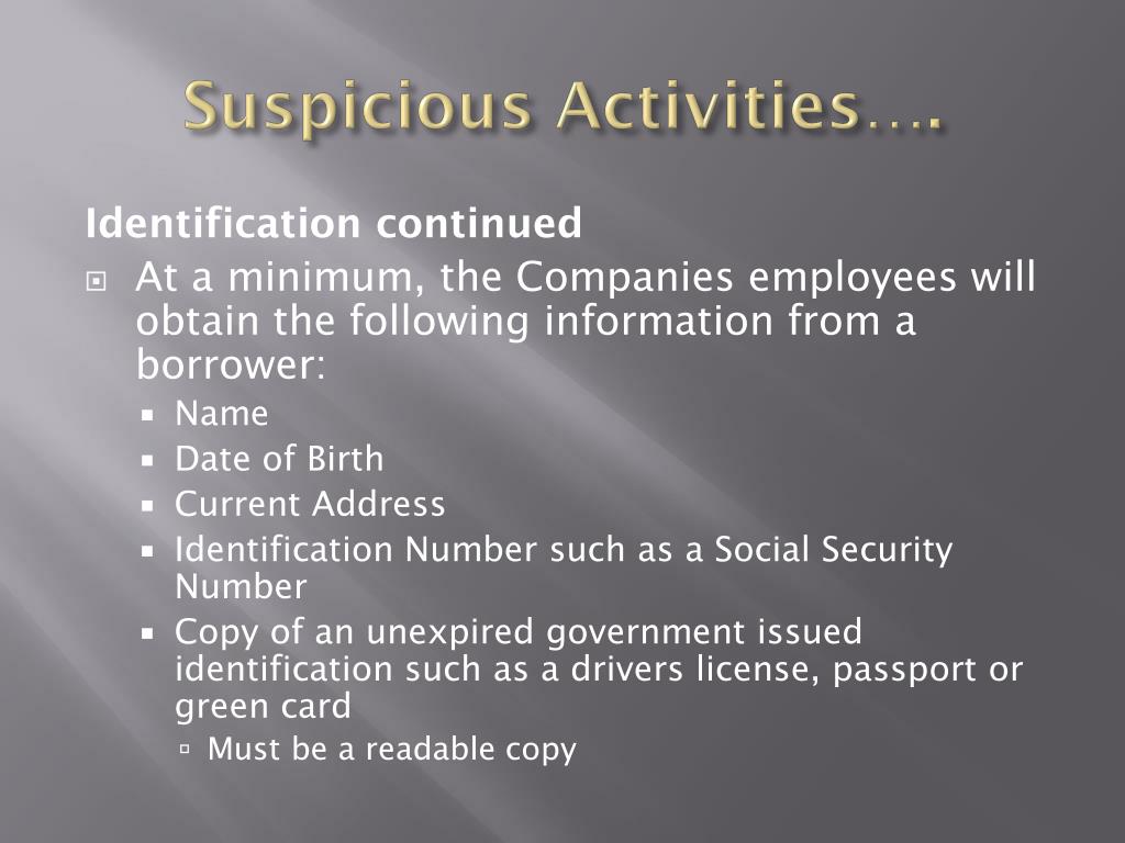 Suspicious Activities…. Identification continued • At a minimum, the Companies employees will obtain the following information from a borrower: • Name • Date of Birth • Current Address • Identification Number such as a Social Security Number • Copy of an unexpired government issued identification such as a drivers license, passport or green card • Must be a readable copy