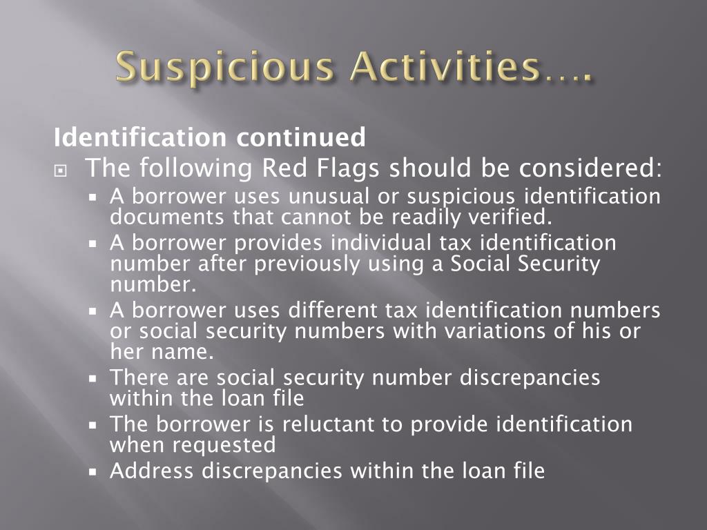 Suspicious Activities…. Identification continued • The following Red Flags should be considered: • A borrower uses unusual or suspicious identification documents that cannot be readily verified. • A borrower provides individual tax identification number after previously using a Social Security number. • A borrower uses different tax identification numbers or social security numbers with variations of his or her name. • There are social security number discrepancies within the loan file • The borrower is reluctant to provide identification when requested • Address discrepancies within the loan file