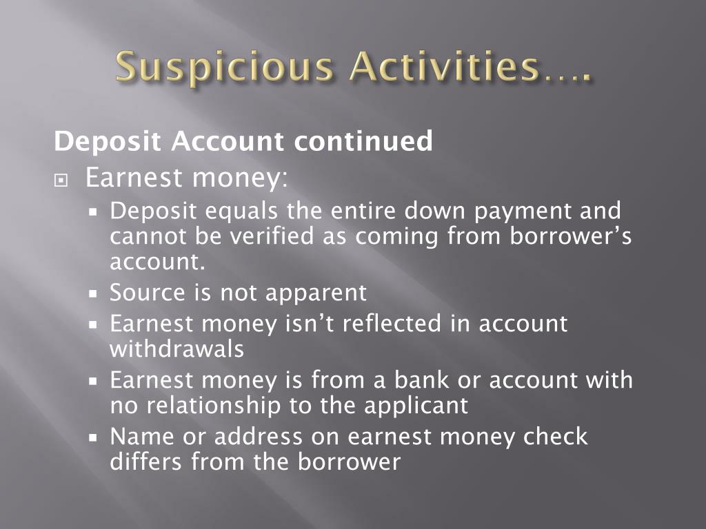 Suspicious Activities…. Deposit Account • Deposit histories can show a pattern of fraud and/or money laundering. The following Red Flags should be considered: • A borrower’s deposit accounts show large unexplained deposits into the account that they are utilizing for the mortgage loan • A borrower makes frequent or large transactions and has no record of past or present employment experience.