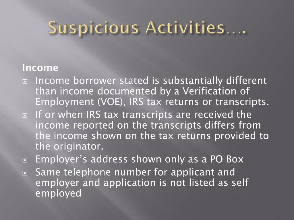 Suspicious Activities…. Income • Income borrower stated is substantially different than income documented by a Verification of Employment (VOE), IRS tax returns or transcripts. • If or when IRS tax transcripts are received the income reported on the transcripts differs from the income shown on the tax returns provided to the originator. • Employer’s address shown only as a PO Box • Same telephone number for applicant and employer and application is not listed as self employed