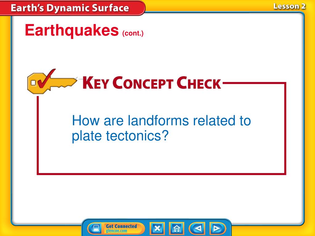 Earthquakes(cont.) How are landforms related to plate tectonics? Lesson 2-1