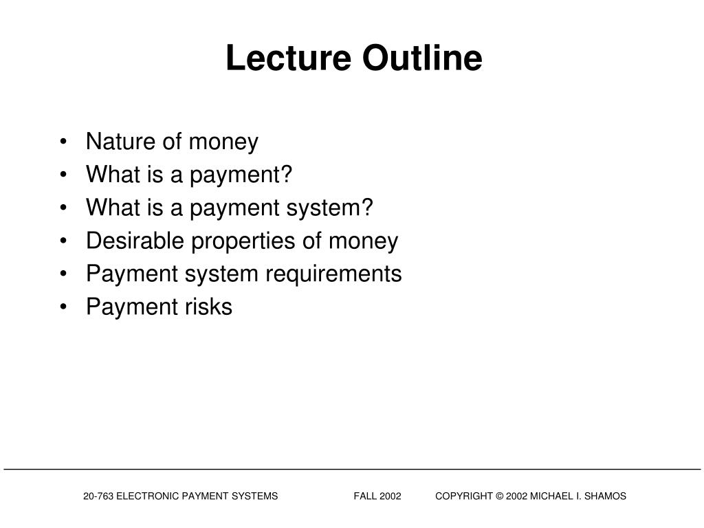 Lecture Outline • Nature of money • What is a payment? • What is a payment system? • Desirable properties of money • Payment system requirements • Payment risks