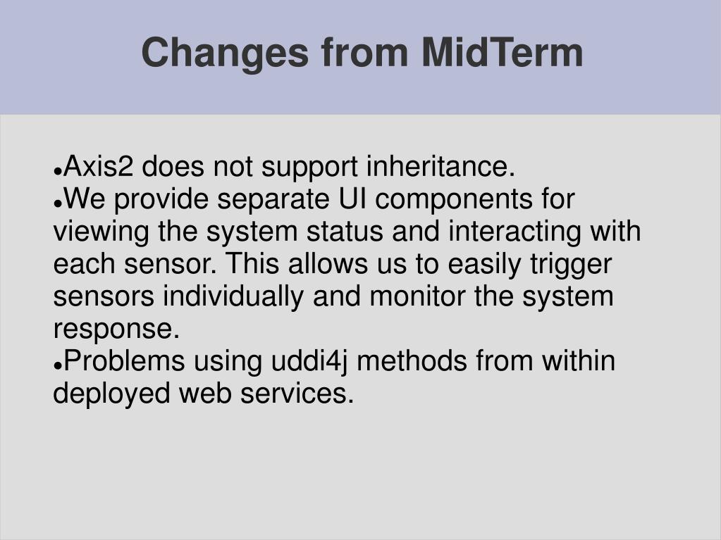 Changes from MidTerm • Axis2 does not support inheritance. • We provide separate UI components for viewing the system status and interacting with each sensor. This allows us to easily trigger sensors individually and monitor the system response. • Problems using uddi4j methods from within deployed web services.