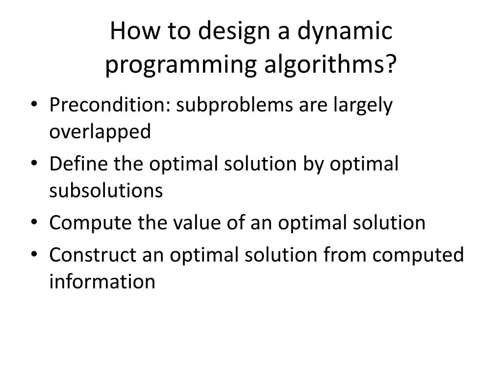 How to design a dynamic programming algorithms? • Precondition: subproblems are largely overlapped • Define the optimal solution by optimal subsolutions • Compute the value of an optimal solution • Construct an optimal solution from computed information